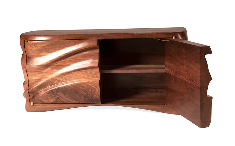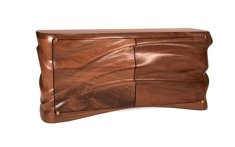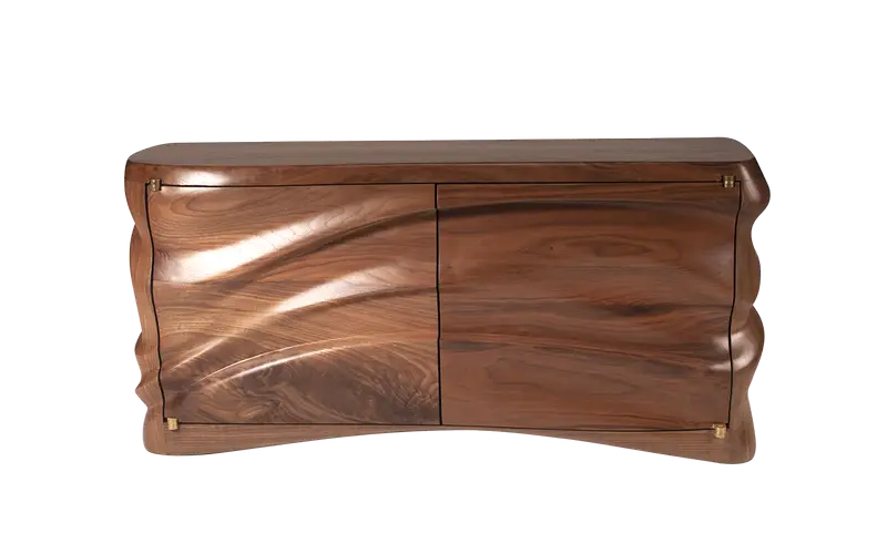 The Adonia Cabinet is a seamless blend of organic movement and refined craftsmanship. Its fluid, undulating wood grain and sculpted surface evoke the natural flow of water, transforming a functional storage piece into a work of art. Each contour highlights the richness of the solid wood, emphasizing its depth and character.