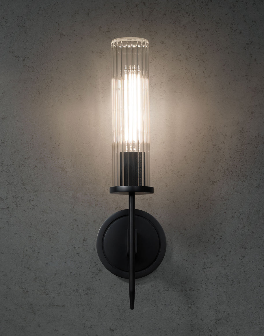 The Alouette Outdoor Sconce is machined from solid brass. All parts are hand polished and powdercoated. Its shade is reeded borosilicate glass, fire-polished by hand.