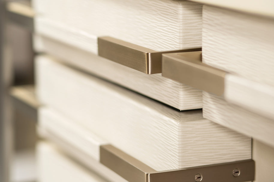 drawers: soft closing glides (interiors lined with leather) pulls: leather wrapped handles top: optional grommet (plated to match metal frame) for cord management available in a desk or console