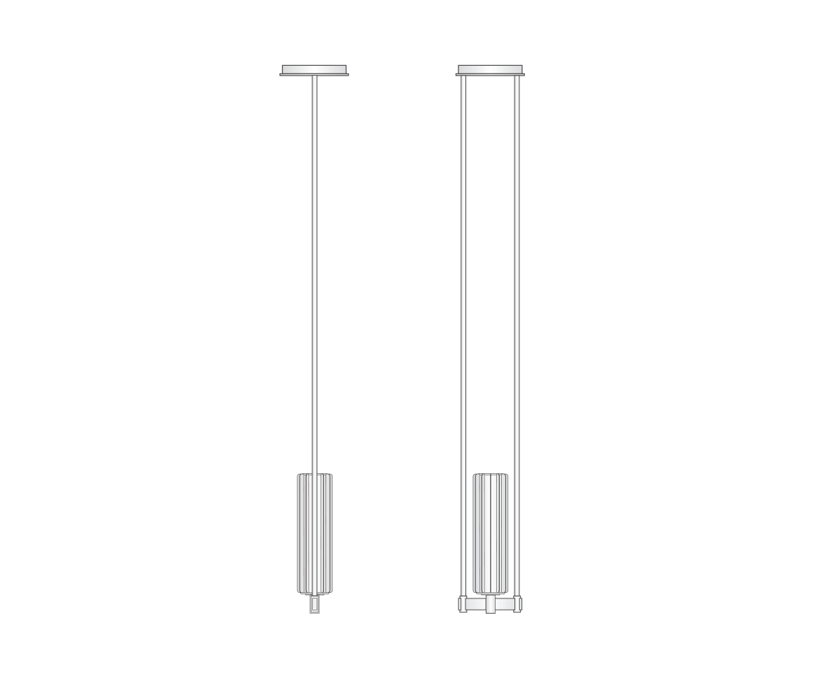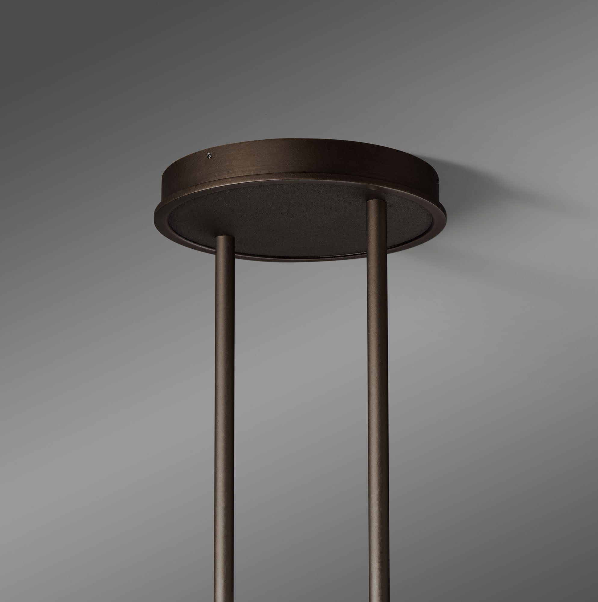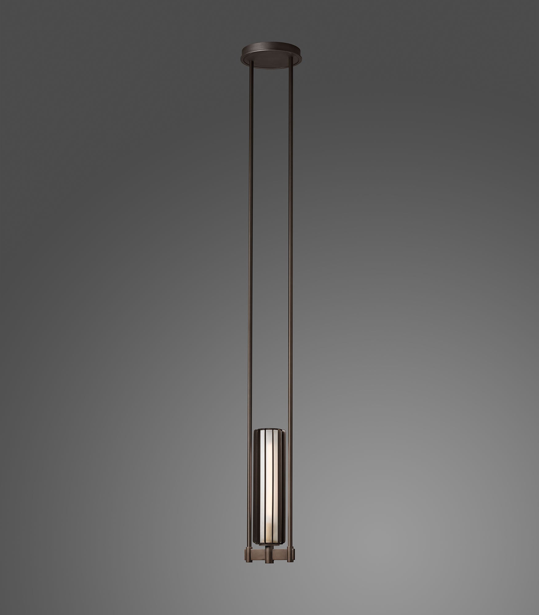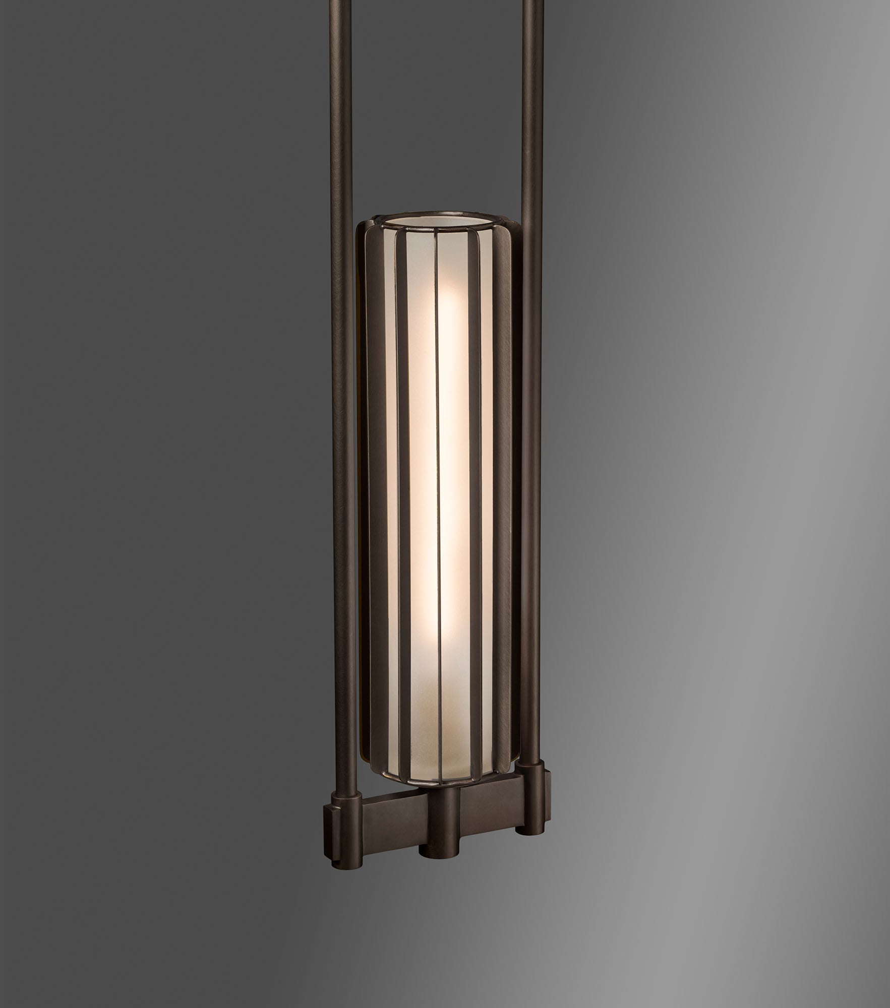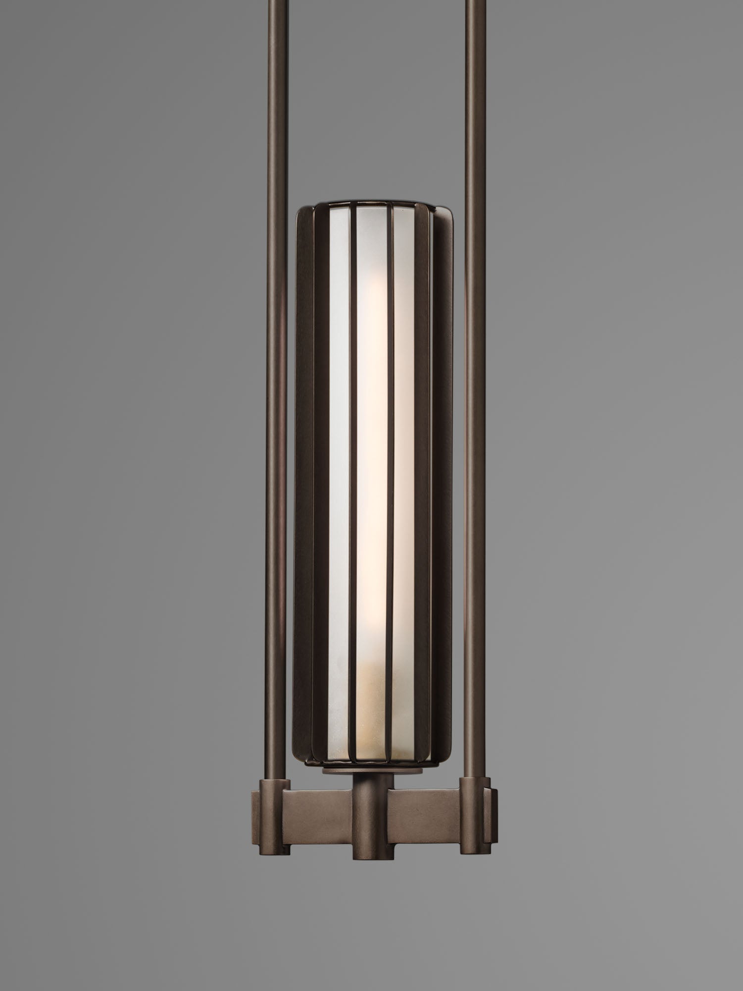 The Duvernois Lavalier is made of solid brass. All parts are hand polished and patina’d. The frosted glass shade is surrounded by a column of brass fins.