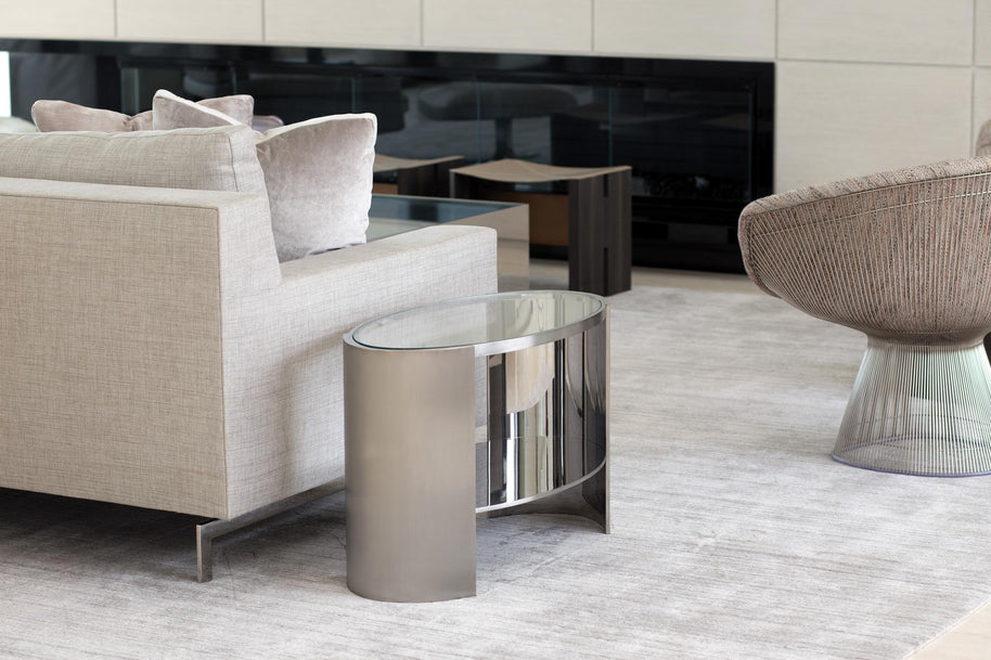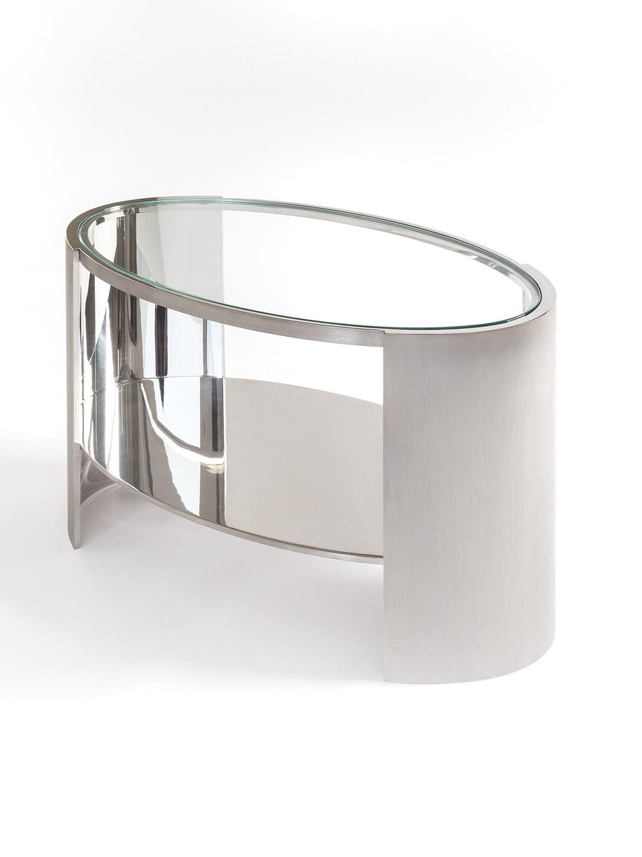 The "Eclipse" is handcrafted in Southern California. The satin stainless steel exterior of this side table eclipses the high-polished stainless steel interior. It’s also available in dark oil rubbed bronze with a light bronze interior.