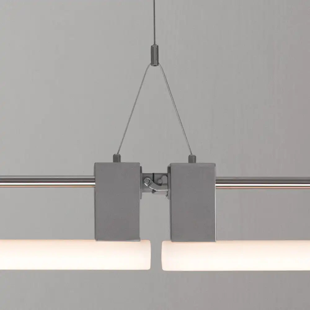This design from EON collection features two centrally connected lights to create a linear lighting object. This is suspended from the ceiling by three transparent cables. Clean, linear and clever lighting for the contemporary home.