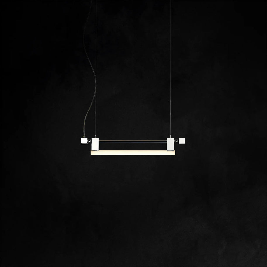 This linear bar light features a single glass tube held in place at each end by two technically rigorous brass fixtures, suspended from both sides by transparent cables.