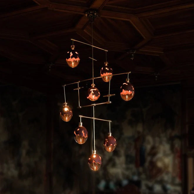 INNER GLOW is a limited-edition designer chandelier that juxtaposes the classic blown glass and brass typical of KAIA chandeliers with a more organic material: paper.
