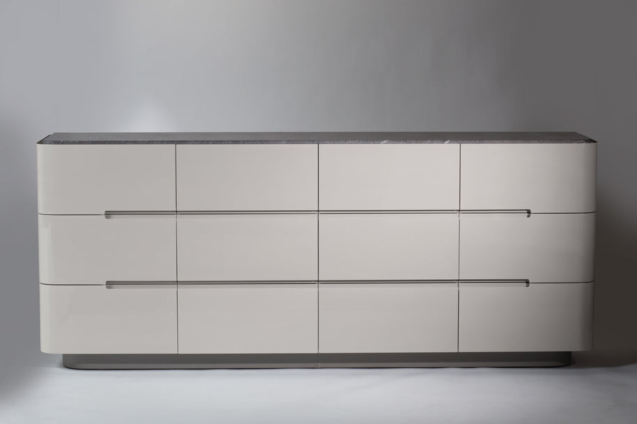 The "Joanna" Dresser, hand crafted in Southern California, has a marble top and lacquer drawers fronts and base. The side panels are available in contrasting lacquer or leather.