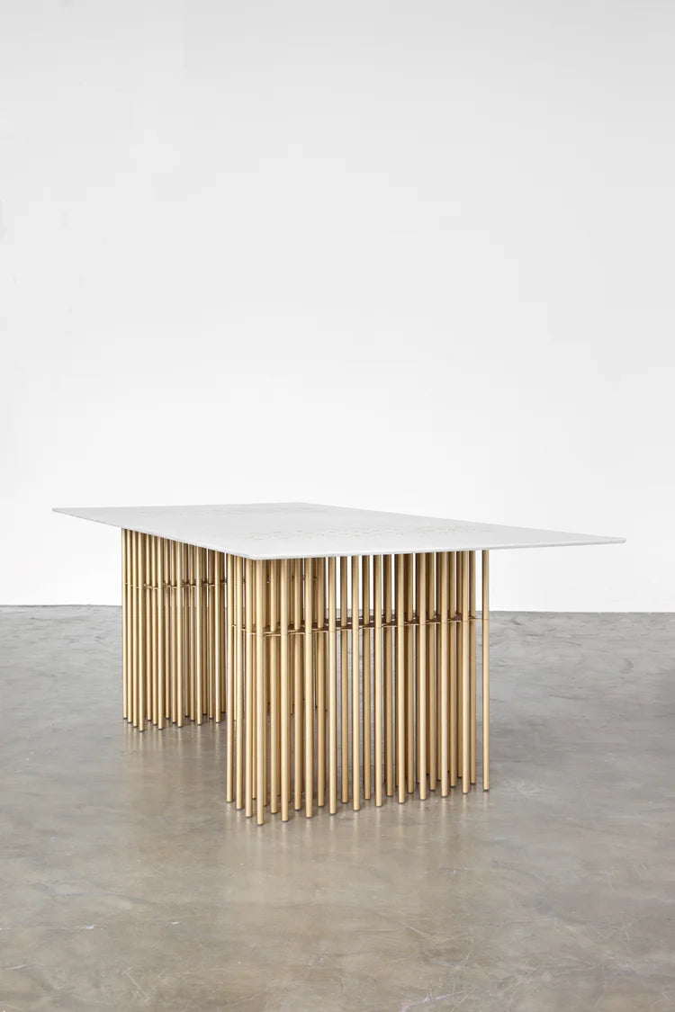The design duo chose to reinterpret rebars into legs, grids into tables, pinion elevators into armoires and cleverly infused the vocabulary of construction throughout their collection. Sébastien also brought his tubing language from his sculptural work - in particular his sound sculptures - which naturally meshed with the pieces. Material-wise, Atelier d'Amis selected ultra-thin and resistant concrete-finish ceramic plates with brass plated tubular steel, marrying the worlds of industrial, contemporary and high-end furniture.