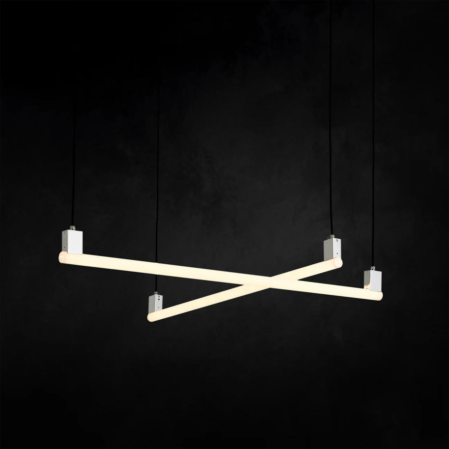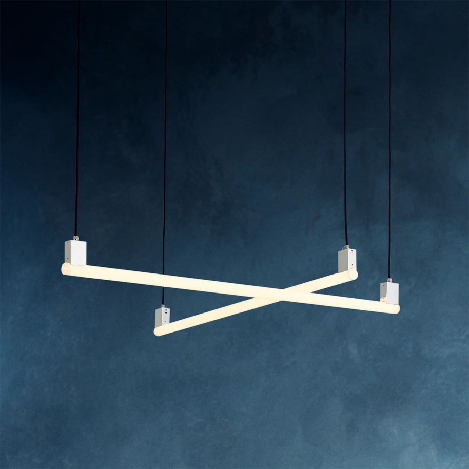 Minimalist modern LED pendant lights that make a statement. MEA'S two tubes of glass are held in place at each end by pared-back brass fixtures, which are then suspended to the ceiling in diagonal opposition to create an impactful contemporary chandelier.