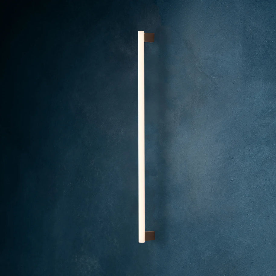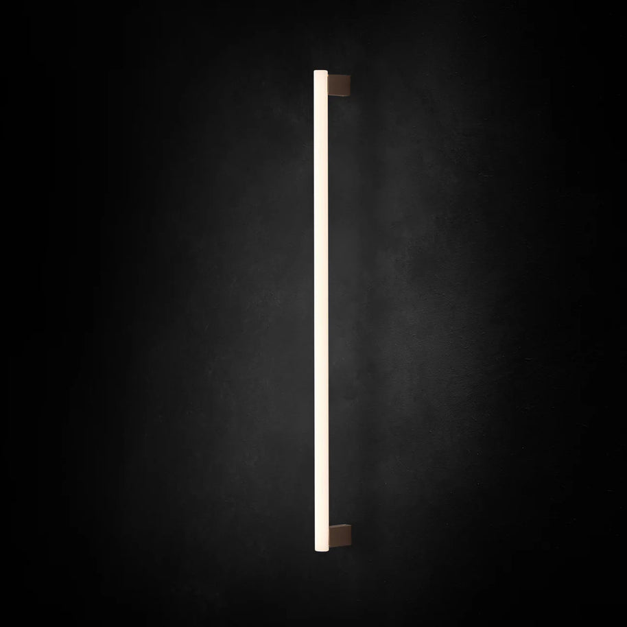 MEA is a modern large wall light that embodies aesthetic minimalism. A 1000 mm tube of glass is anchored to the wall or ceiling by brass fixtures at each end, transforming the linear lamp into an aesthetic object.