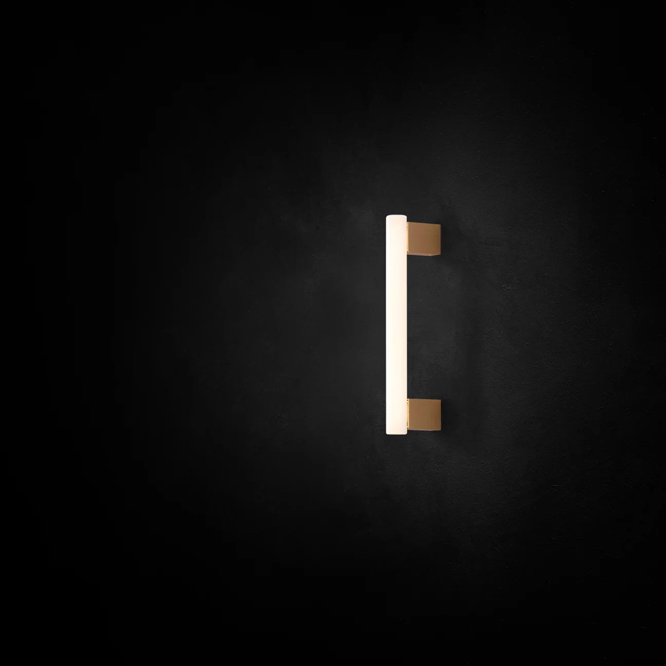 MEA is a minimalist wall light that embodies aesthetic minimalism. A 300mm tube of glass is anchored to the wall or ceiling by brass fixtures at each end, transforming the linear lamp into an aesthetic object.