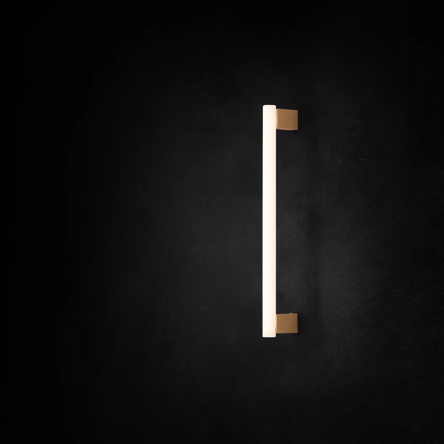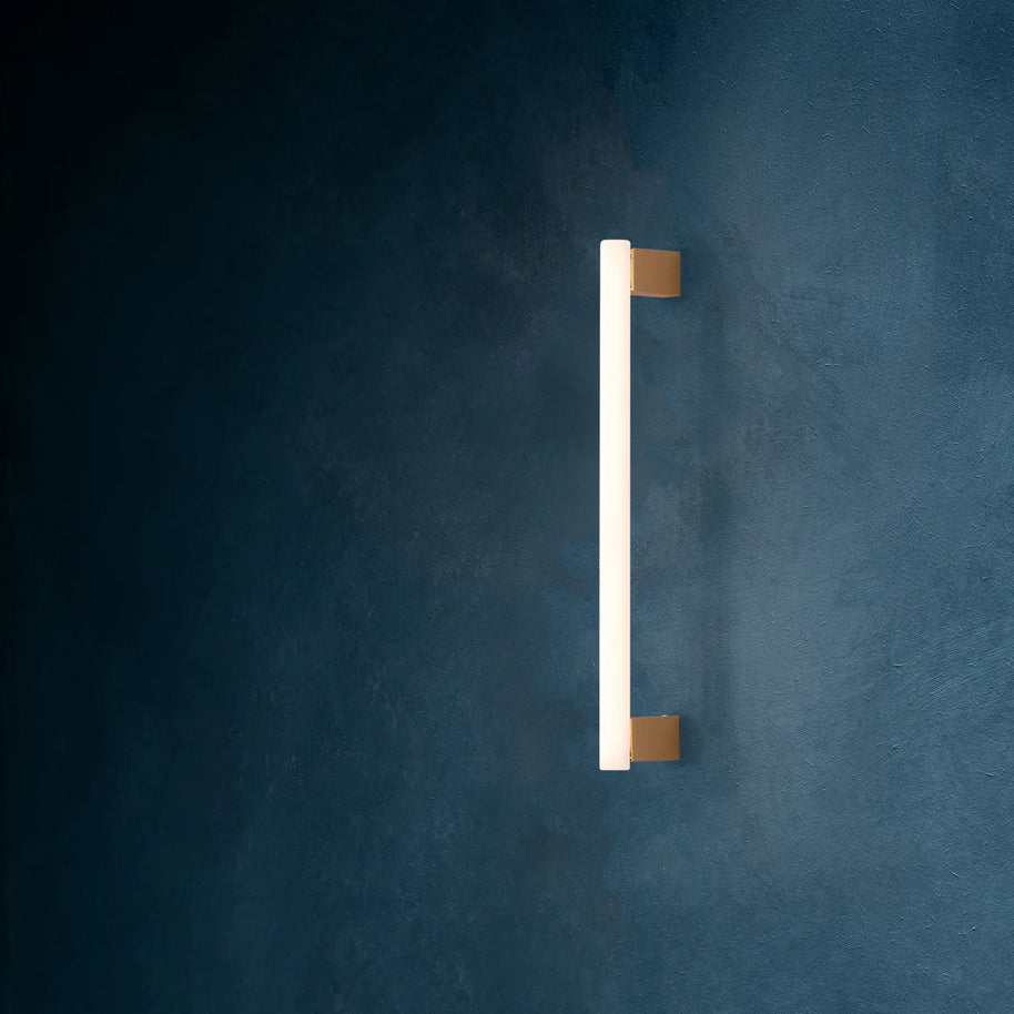 MEA is a collection of designer wall lights that embodies aesthetic minimalism. A 500 mm tube of glass is anchored to the wall or ceiling by brass fixtures at each end, transforming the linear lamp into an aesthetic object.
