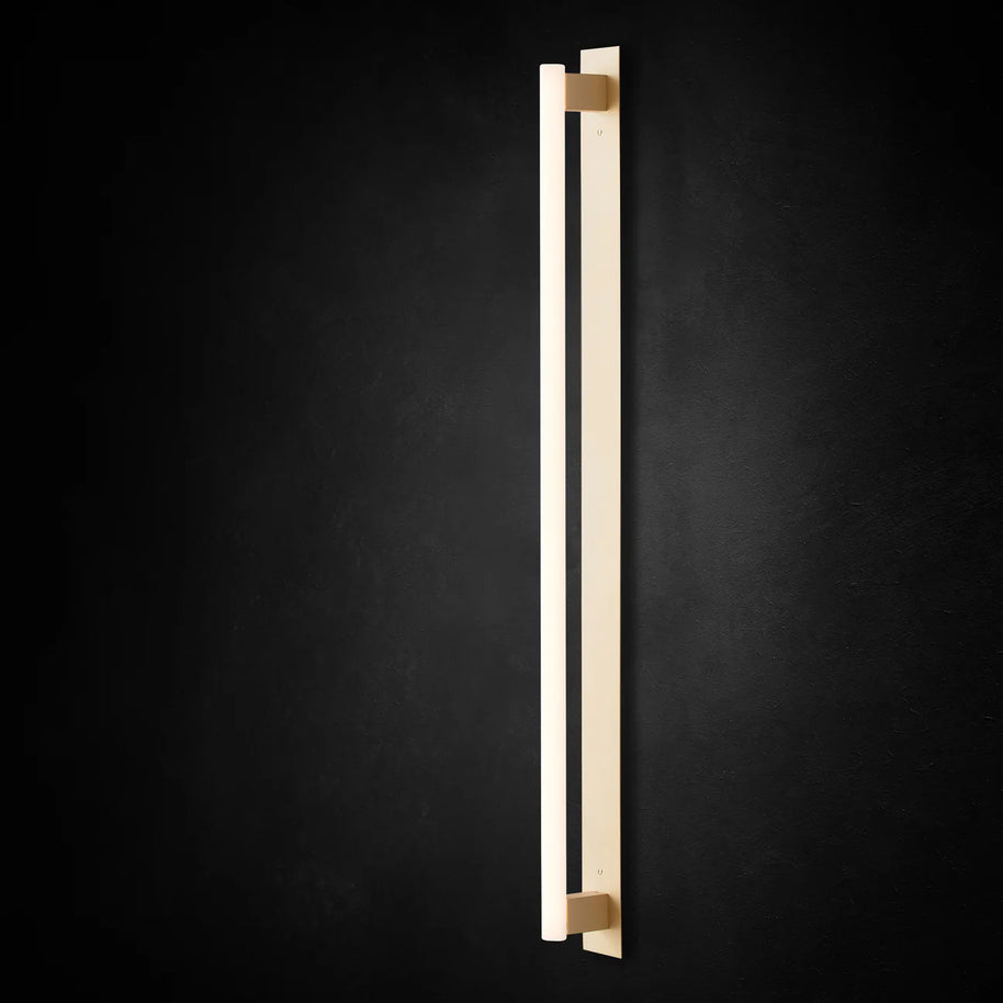 MEA 100 is a collection of large wall lights that embodies aesthetic minimalism. A 1000 mm tube of glass is anchored to the wall by brass fixtures at each end, with a brass back plate that mirrors the soft glow of the light. This is the linear lamp as an aesthetic object.
