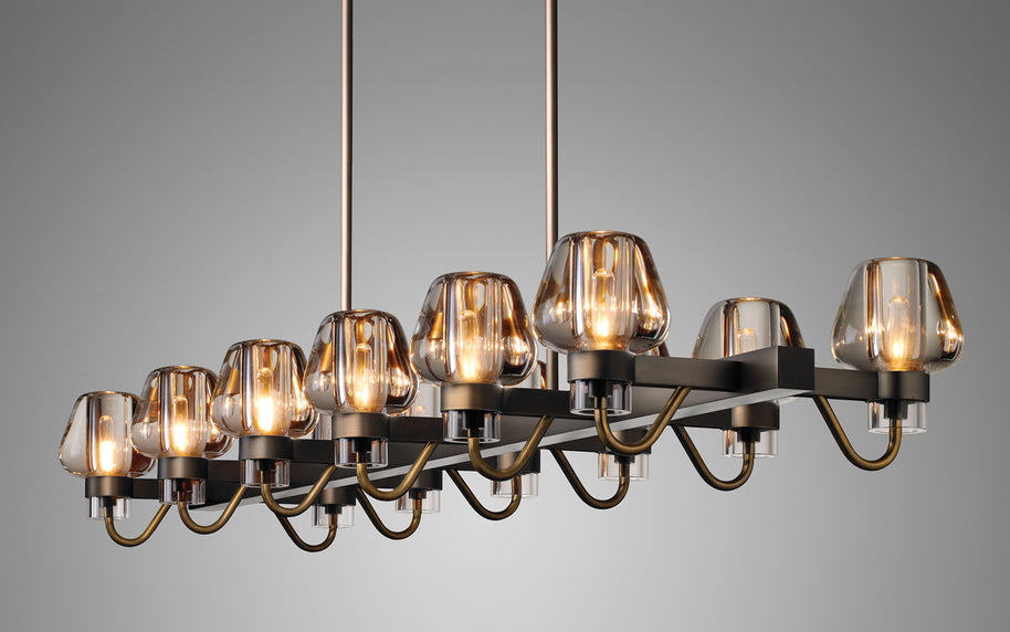 The Montalembert Linear Chandelier is machined from solid brass. All parts are hand polished and patina’d. The lead crystal shades are carved and polished by hand.