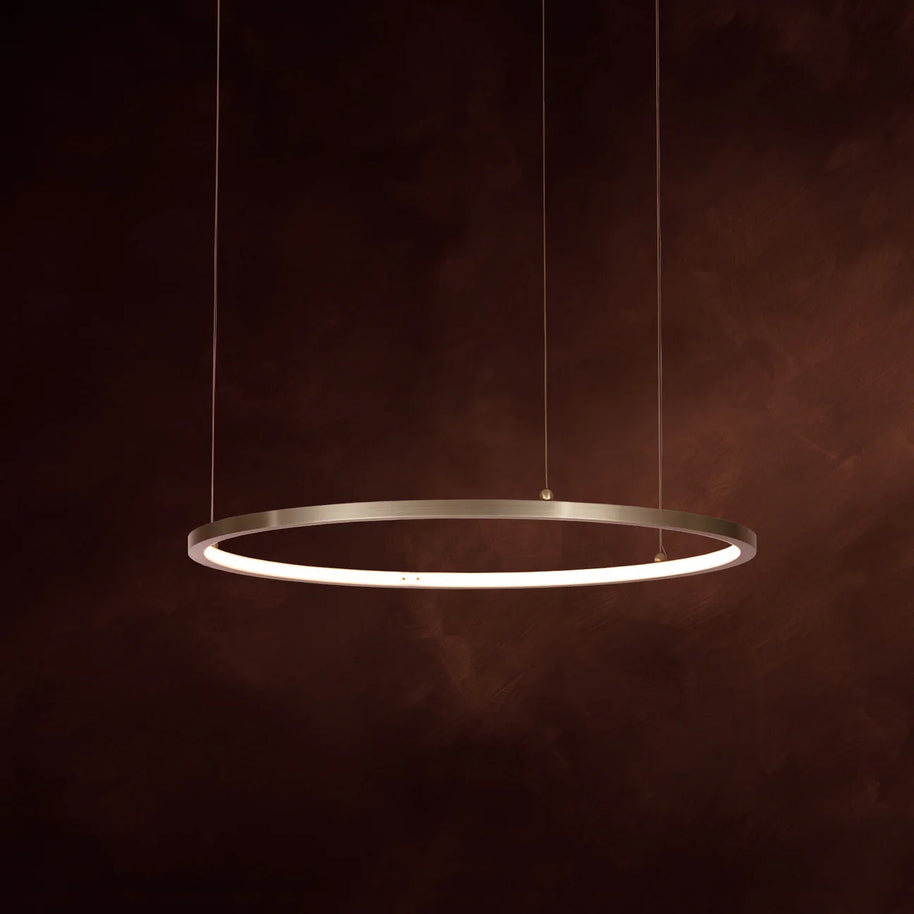 The RIO In Suspension is a ring ceiling light with a large solid brass ring embedded with LED lights on the inside only. This ring of light is then suspended by near-invisible brass wires from a smaller ring. The result is a lighting object that appears to hover effortlessly in mid-air, casting sculptural shadows onto the ceiling.