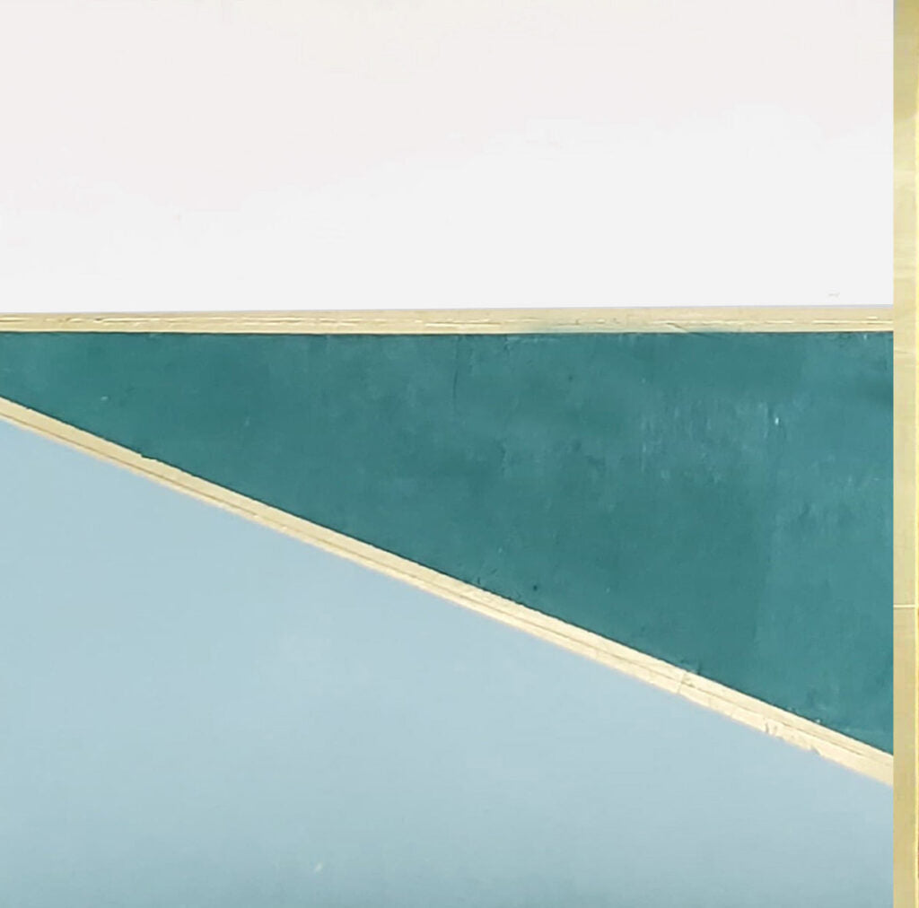 Three-color, large scale, random geometric pattern in polished plaster edged in gold leaf.